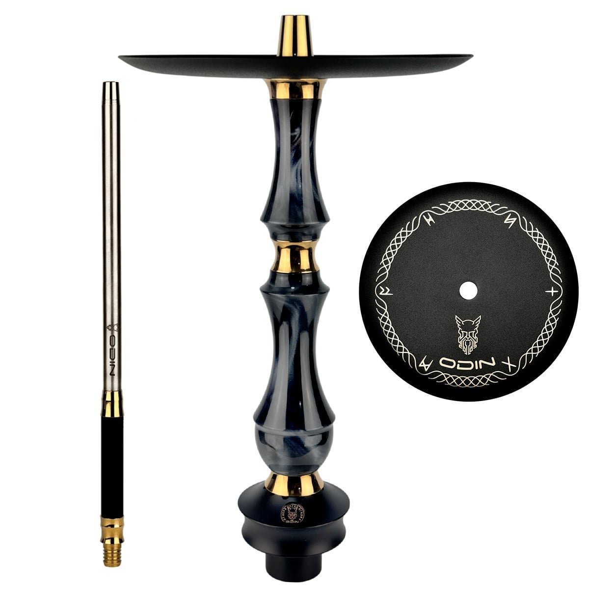 Металеві деталі кальяна виготовлені з полірованої нержавіючої сталі, покриті титаном для підвищеної міцності та надання золотистого відтінку. Унікальне лиття епоксидної смоли, виконане вручну, надає кожному кальяну індивідуальність та неповторний стиль. Кожен малюнок на поверхні унікальний, що робить кожен кальян ODIN Epoxy витвором мистецтва.