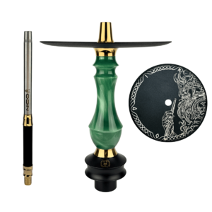 Металеві деталі кальяна виготовлені з полірованої нержавіючої сталі, покриті титаном для підвищеної міцності та надання золотистого відтінку. Накладки виконані з епоксидної смоли, а витончена форма надана деталі вручну. Фінальний етап полірування готової накладки надає їй блиску і сяйва перламутра.